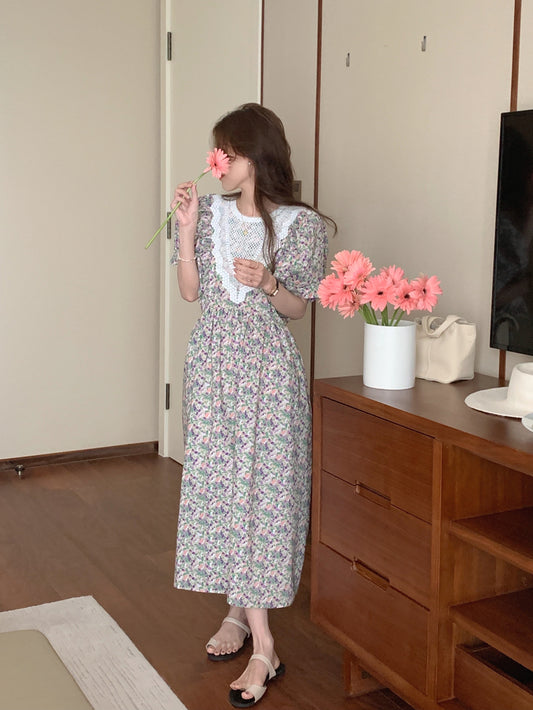 【F60562】氣質溫柔白月光🕊️復古泡泡袖花邊領拼接寬鬆長版連身洋裝260413