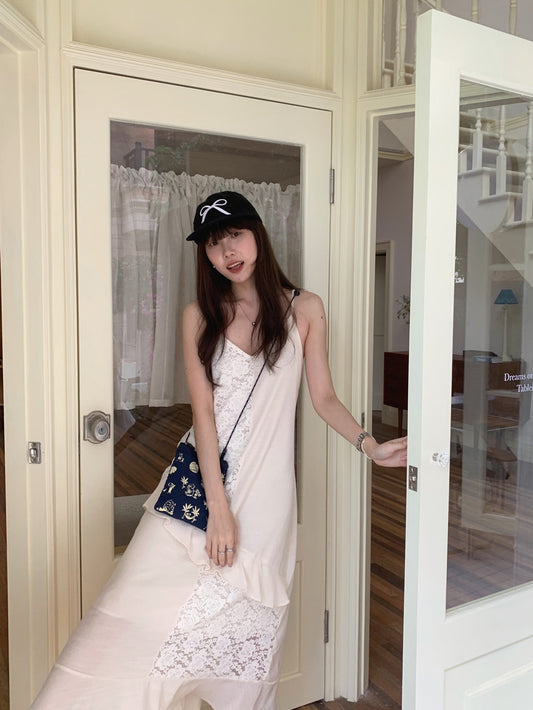 【F60564】法式小眾高級感✨重工蕾絲拼接細肩帶無袖氣質長版洋裝260413