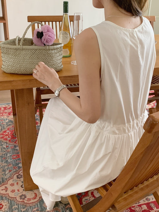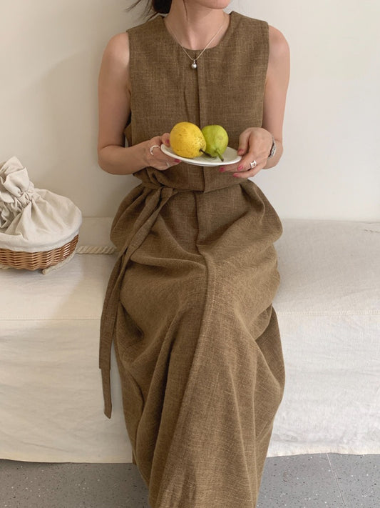 【F60563】法式慵懶度假風🌴小眾復古抽繩設計無袖背心寬鬆長版洋裝260413
