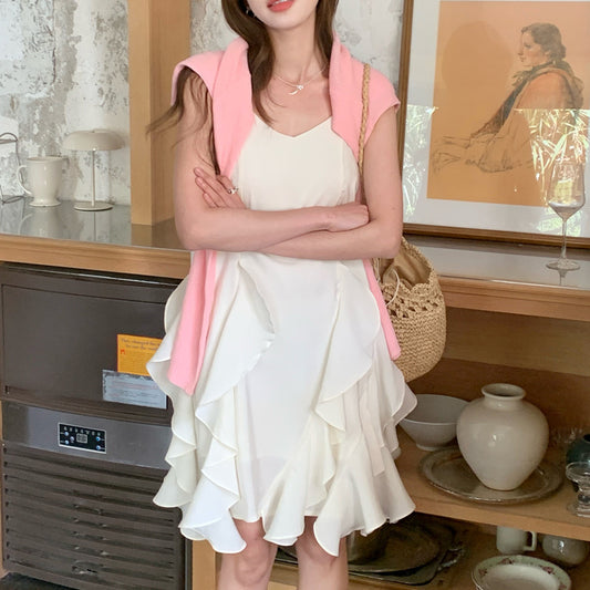 【F60565】仙女降臨✨今年爆款超仙氣花瓣荷葉邊不規則細肩帶短洋裝260413