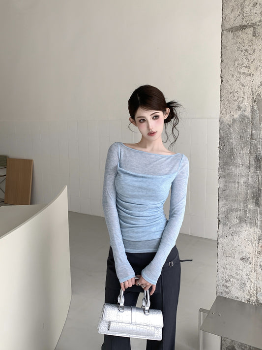 【F60561】法式純慾微性感🤍輕透拼接垂墜領假兩件長袖修身顯瘦T恤260413