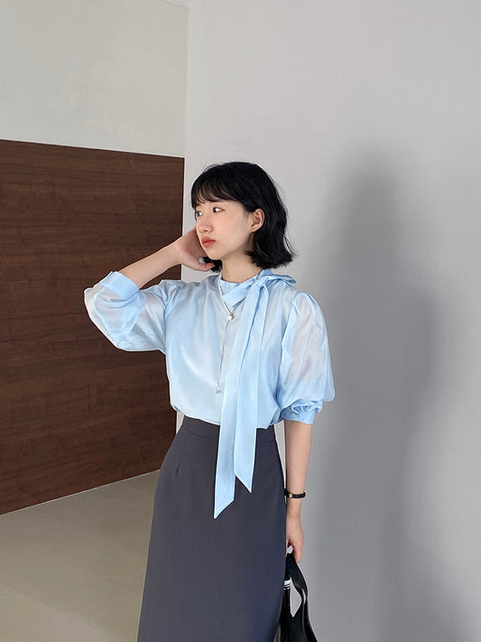 【cimz1186】韓系知性通勤🤍質感蝴蝶結飄帶天絲半高領長袖襯衫260319