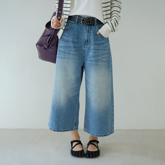 【LD11179】實拍S~XL美式復古時髦✨水洗藍刷破貓鬚寬鬆九分牛仔寬褲260317