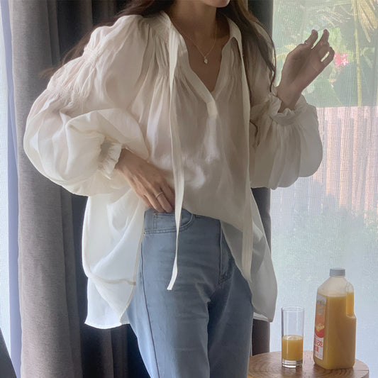 【F60105】實拍法式仙氣飄帶褶皺長袖襯衫250212