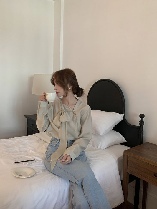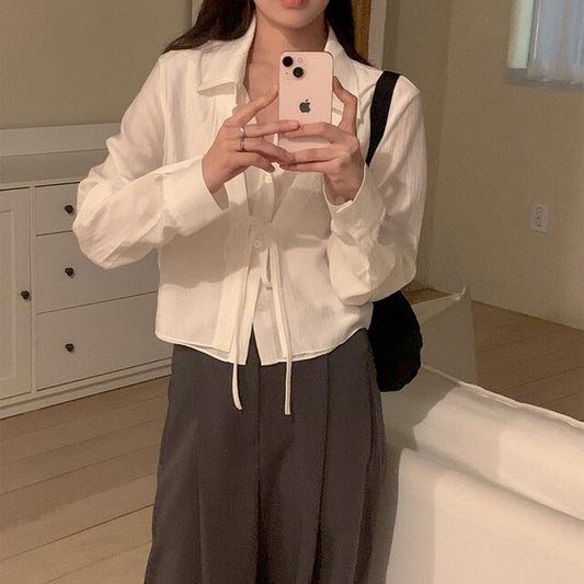 【F60103】實拍早春多種穿法蝴蝶結綁帶斜扣長袖襯衫250212