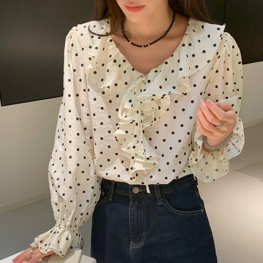 【F60107】實拍法式復古點點荷葉雪紡襯衫250212