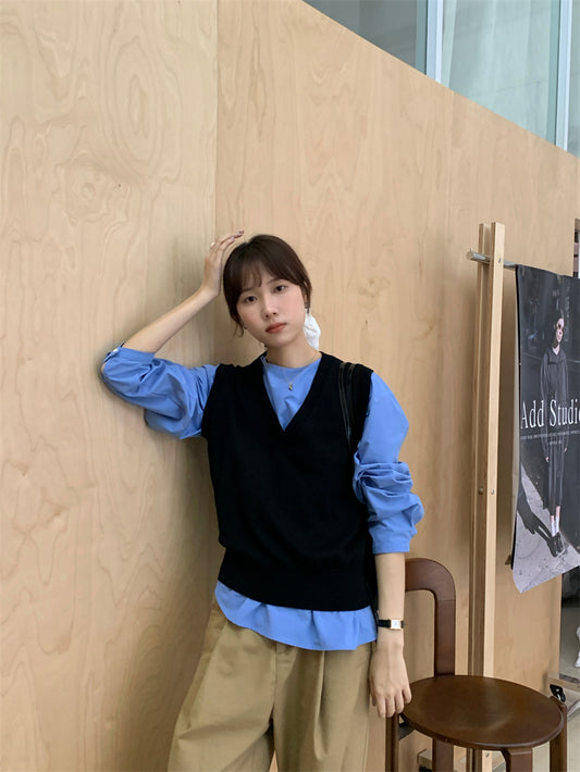 【F01219】春秋小眾設計感假兩件繫帶襯衫250113