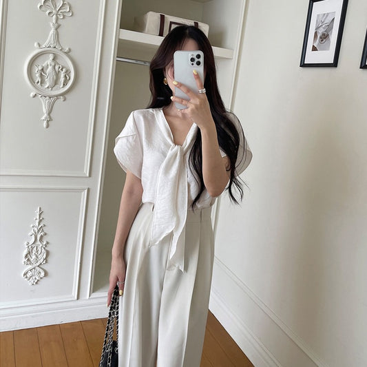 【F60413】韓國夏季法式荷袖飄帶上衣250526