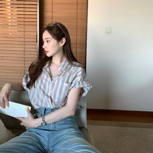 【F60407】韓國夏季條紋短袖襯衫250526