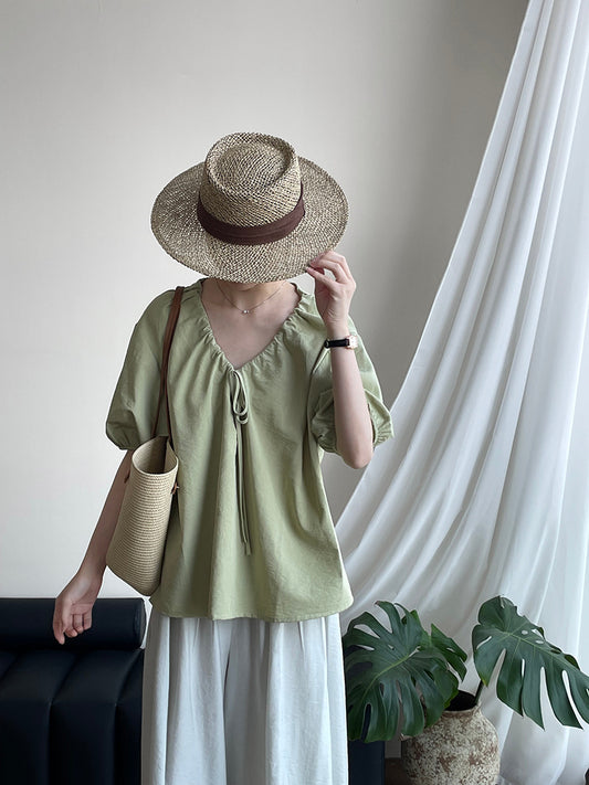 【F60423】韓系簡潔氣質繫帶泡泡袖襯衫250526