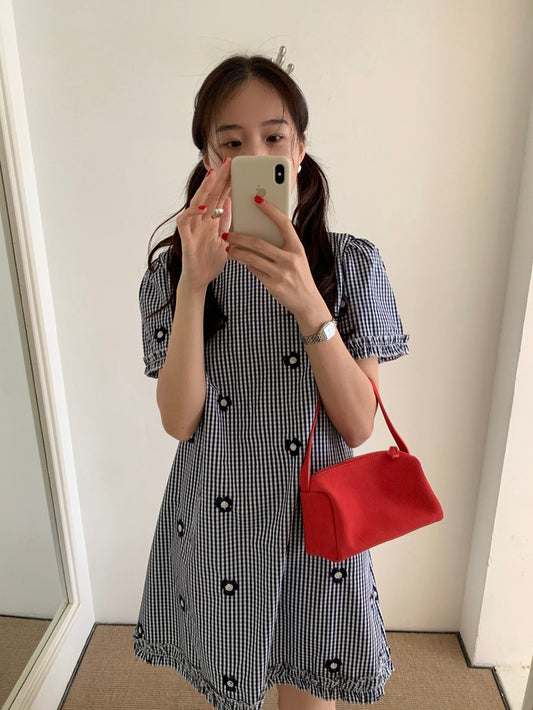 【F60482】實拍韓系甜美刺繡小荷葉短版洋裝250616