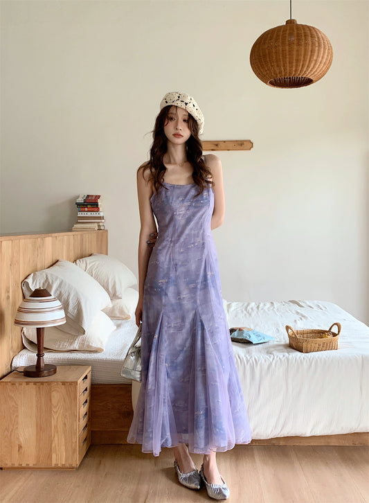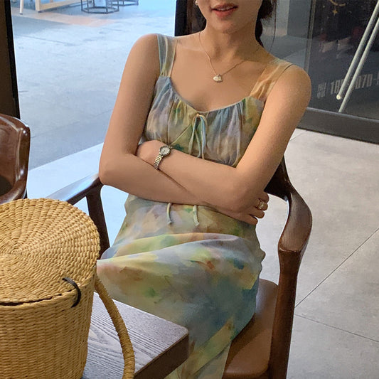 【F60371】實拍油畫浪漫雪紡印花法式吊帶洋裝250512