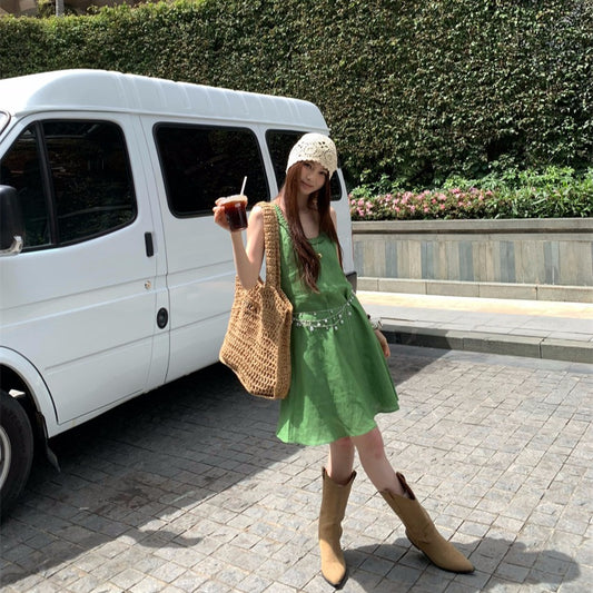 【F60395】實拍復古京綠亞麻天絲洋裝250526