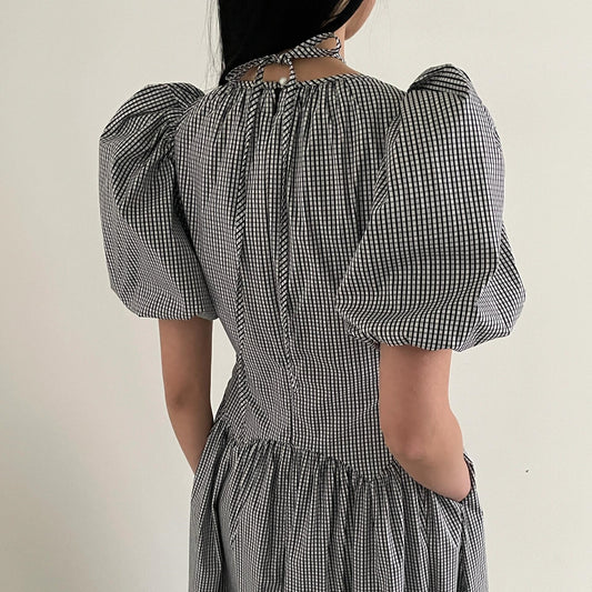 【F60416】韓國東大門復古高級感繫帶格子露腰泡泡袖洋裝250526