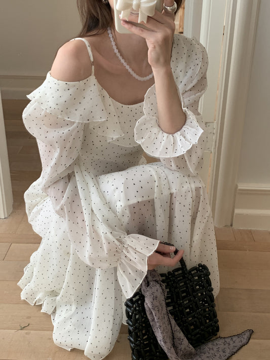 【F60251】實拍小眾復古法式不規則設計波點露肩長洋裝250304