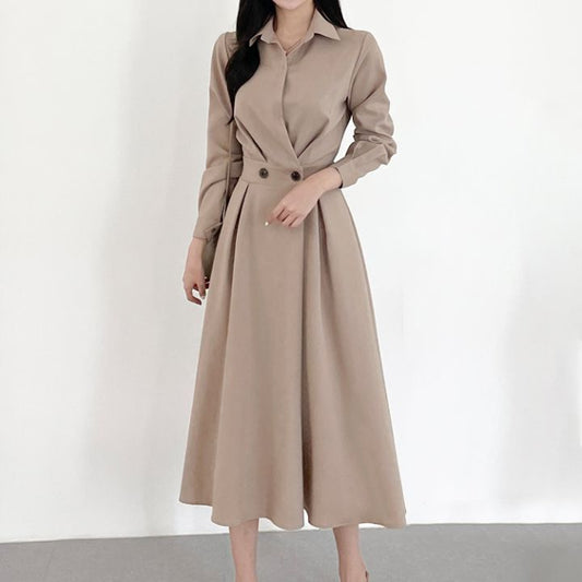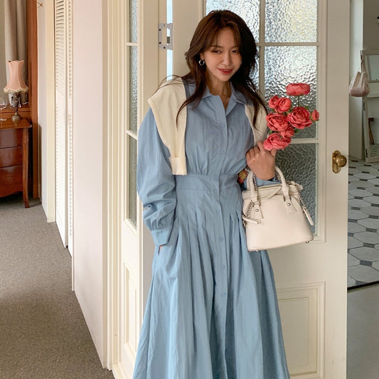 【F60186】實拍春季法式翻領收腰百褶襯衫洋裝250225