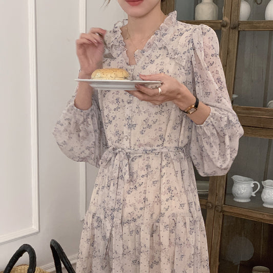 【F60106】實拍仙仙仙女裙~V領木耳邊碎花長袖繫帶洋裝250212