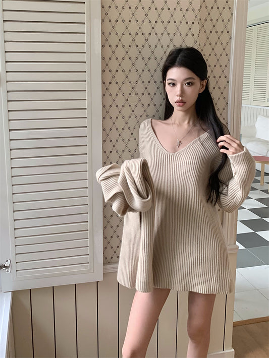 【F01232】實拍氣質V領純色針織中長款毛衣+圍巾250113