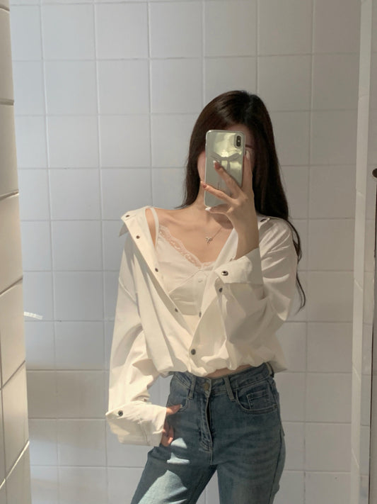 【F60167】實拍韓系假兩件蕾絲邊背心襯衣250218