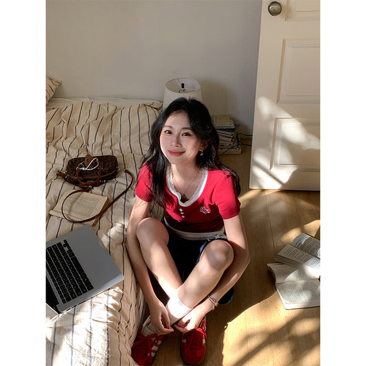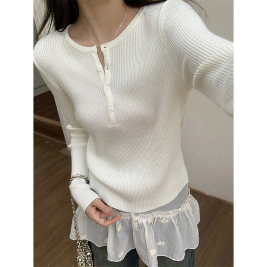 【F60145】實拍假兩件蕾絲短版t恤250218