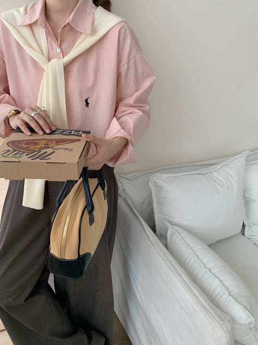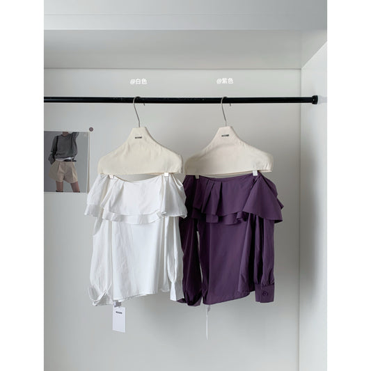 【F60169】實拍法式小心機斜肩長袖襯衫250218