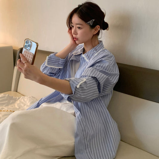【F60173】實拍春夏刺繡小馬條紋長袖襯衫250218