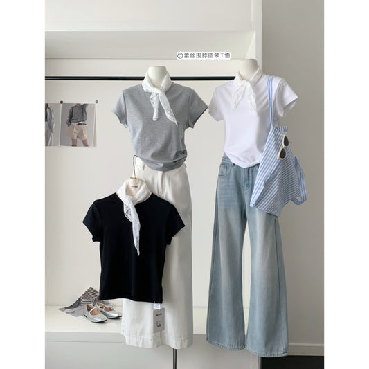 【F60176】實拍春季磨毛棉質T恤+蕾絲絲巾250218
