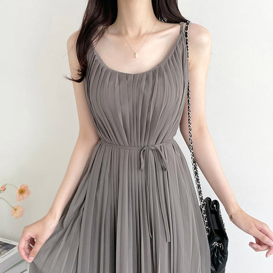 【F032294】韓國法式優雅温柔百褶寬鬆繫帶吊帶洋裝250311