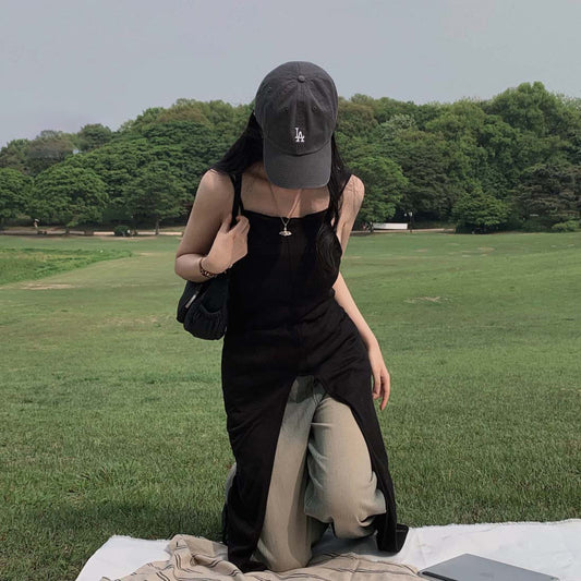 【F032288】韓國ins法式氣質開叉設計針織抽繩長吊帶洋裝250311