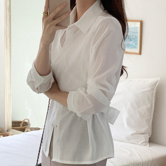 【F032293】韓國法式氣質設計感交叉蝴蝶結綁帶襯衫250311