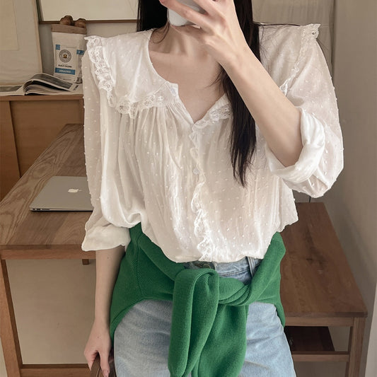 【F032284】韓國温柔浪漫蕾絲點點長袖雪紡衫250311