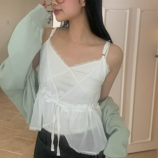 【F032283】韓國清新蕾絲花邊抽繩疊穿雪紡小背心罩衫250311