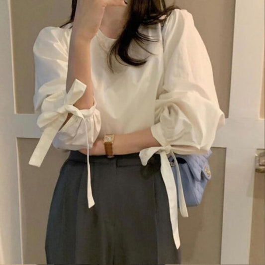 【F60189】春季設計感蝴蝶結綁帶燈籠袖襯衫250225