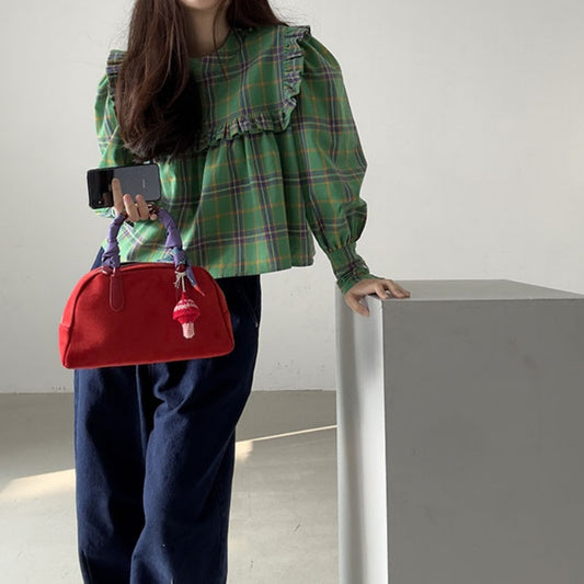 【F60197】現貨韓國復古氣質荷葉格紋寬鬆長袖襯衫250225