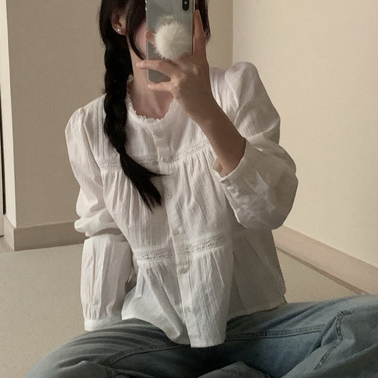 【F60198】韓國復古氣質蕾絲拼接泡泡袖襯衫250225