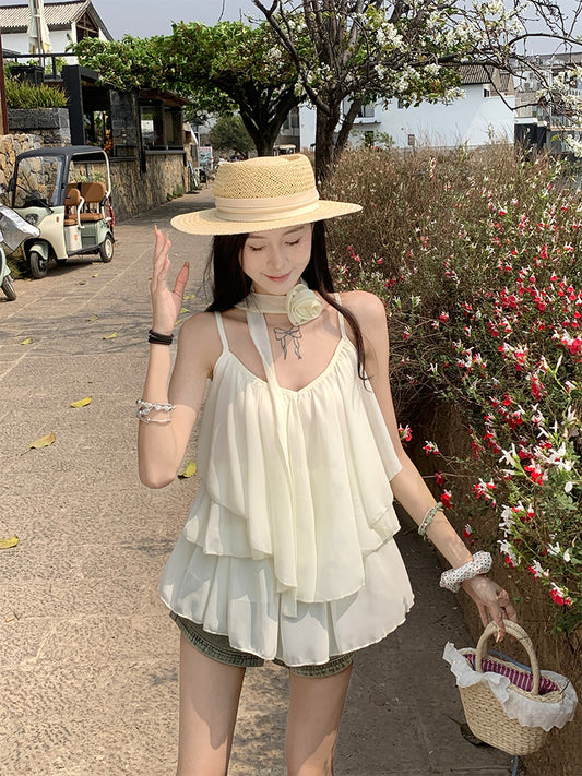 【F60333】實拍夏天復古小眾氣質平口上衣(含胸墊)+褲子套裝250408