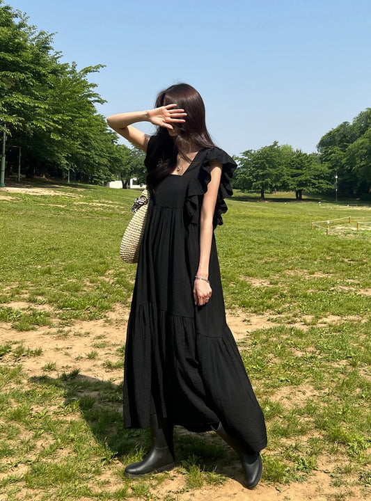 【F60385】實拍夏季氣質方領抓皺荷葉飛袖雪紡洋裝250512