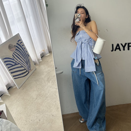 【F60387】現貨實拍 慵懶條紋寬鬆牛仔褲 拖地長褲 休閒風格250512