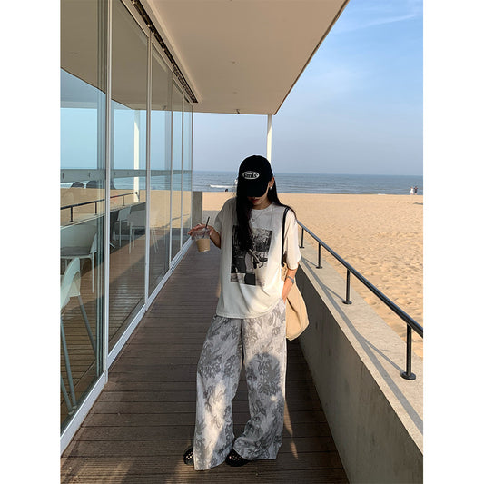 【H5289】實拍韓系復古印花高級感舒適闊腿褲(後鬆緊腰)250603
