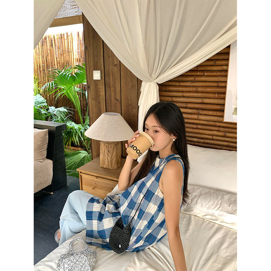 【H5231】實拍夏日清爽棉質復古藍格背心洋裝250506