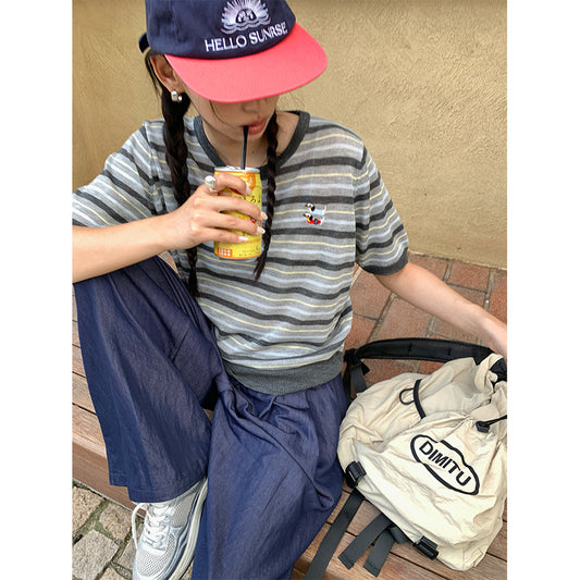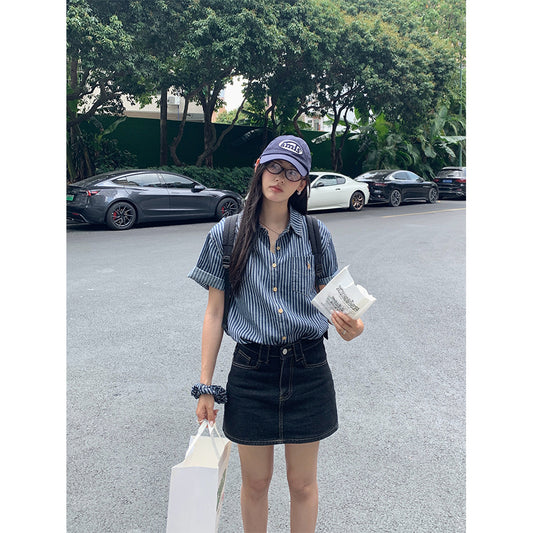 【H5222】實拍夏季休閒復古|條紋口袋刺繡短袖襯衫+髮圈250429