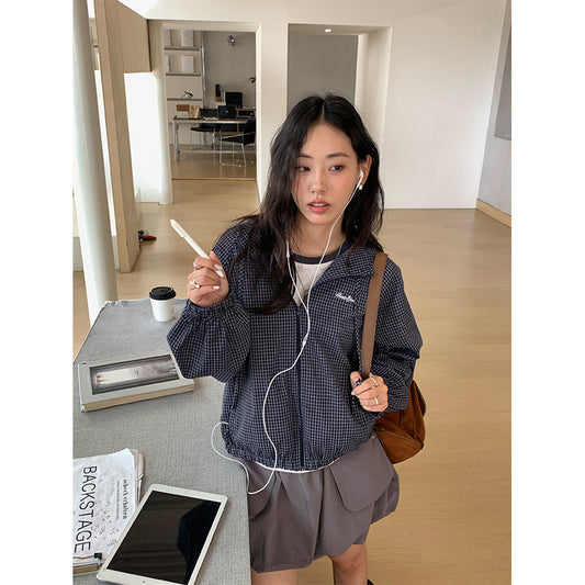 【H5414】實拍早秋微甜格子短版連帽拉鍊外套250909
