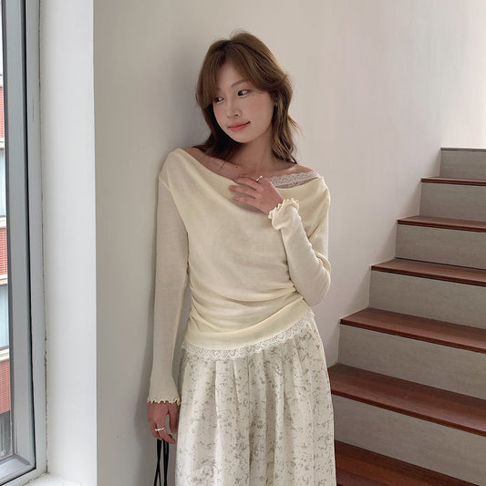 【L2788】實拍蕾絲拼接蕩領露肩長袖針織衫(6%羊毛)250825