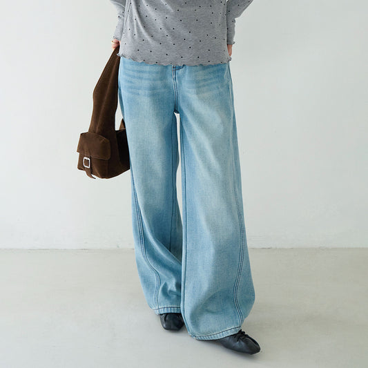 【LD11082】實拍S~XL加絨加厚淺藍色高腰寬鬆闊腿牛仔彎刀褲+皮帶251222