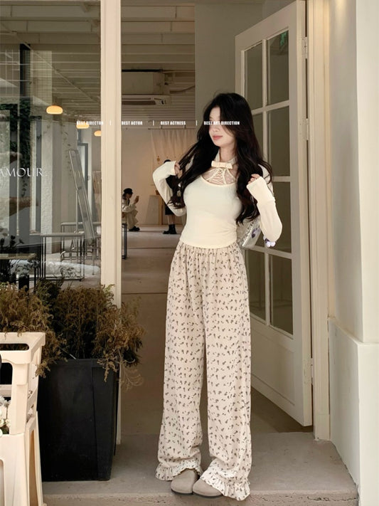 【F60233】實拍韓版純色圓領T恤+屁簾綁帶微喇休閒褲 套裝250304