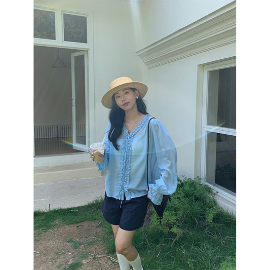 【F60463】實拍超辣的復古繫帶襯衫+中腰彈性牛仔喇叭褲250616