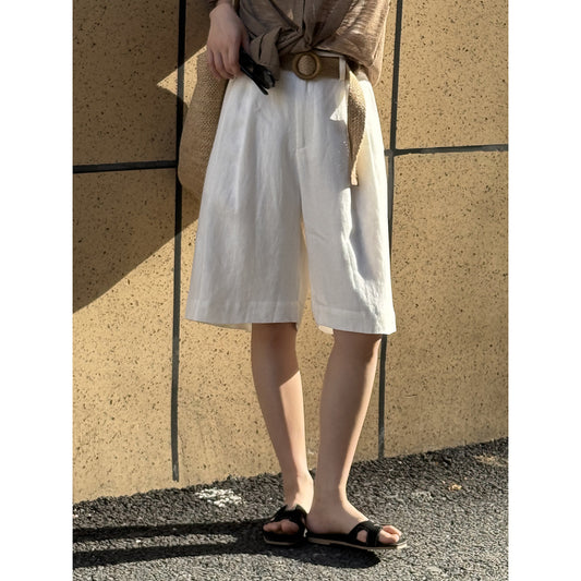 【Y9803】 夏季法式簡約純亞麻五分褲(有內裡,含腰帶)250529