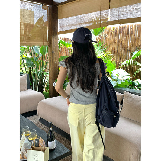 【L8792】實拍檸檬家 夏季亞麻收腰上衣+高腰闊腿褲 套裝250519
