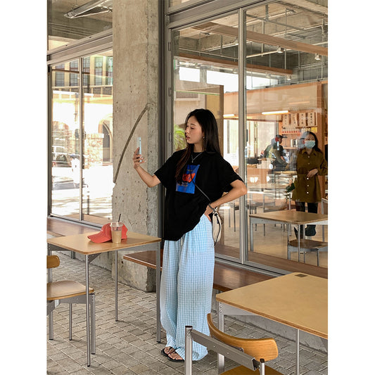 【H5212】實拍韓版格紋休閒鬆緊腰直筒褲250422