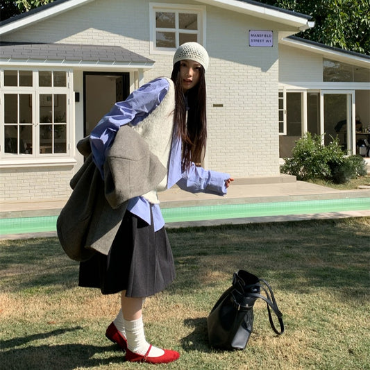【F01115】實拍軟糯白色針織背心+毛呢百褶裙+襯衫(分開下單)250106